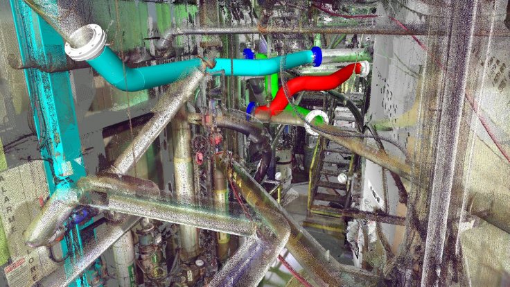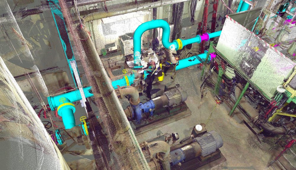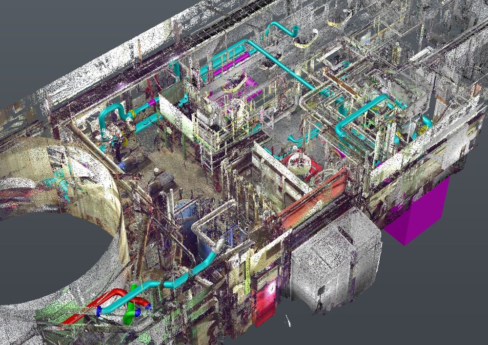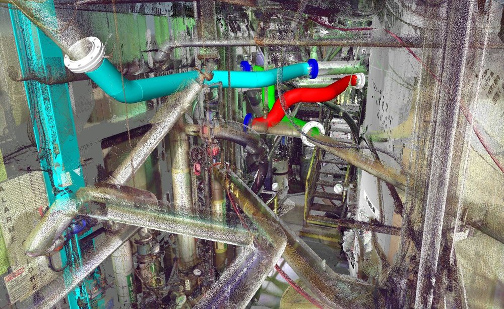 3D scan, 3D modeling and piping fabrication drawings. The 3D scan allowed a fast survey despite restricted and cluttered spaces. With the point cloud, precise 3D modeling and reduction of installation time.
