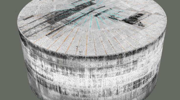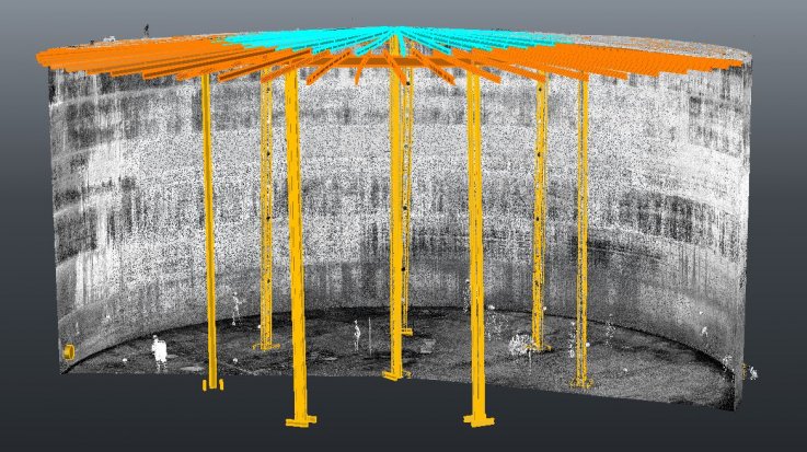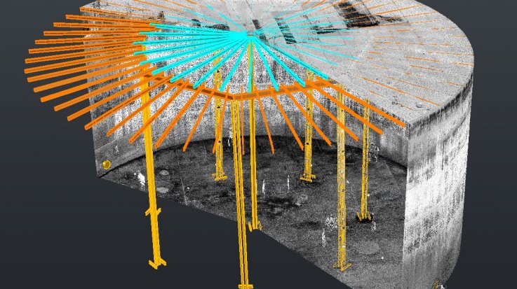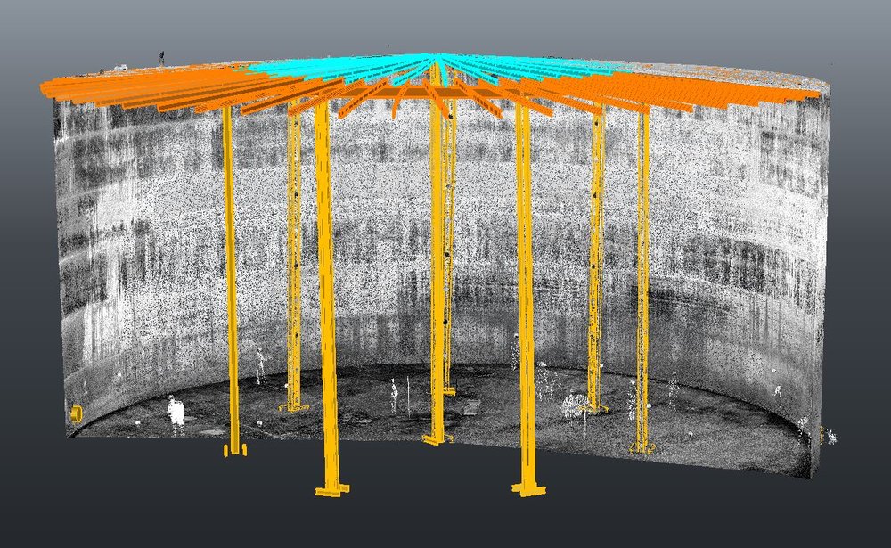 Dado que el tanque había sufrido una deformación significativa tras un incidente, escanear en 3D era la solución ideal para medir los daños. La nube de puntos creada de esta manera permitió realizar un modelo 3D preciso de las estructuras afectadas.