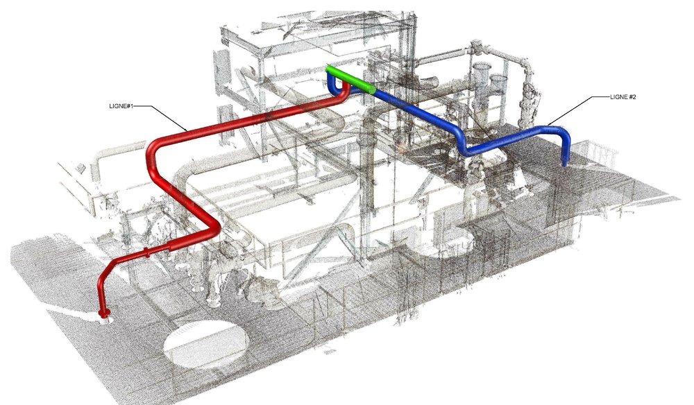 Dibujos "tal como fue construido" (escaneado y modelado en 3D) de todo el sistema de tuberías para la sustitución de tuberías de fibra de vidrio.