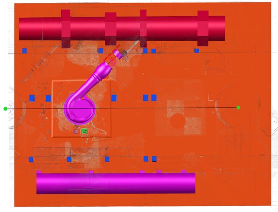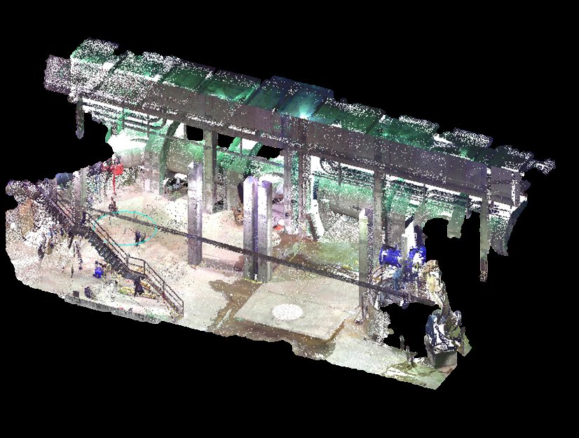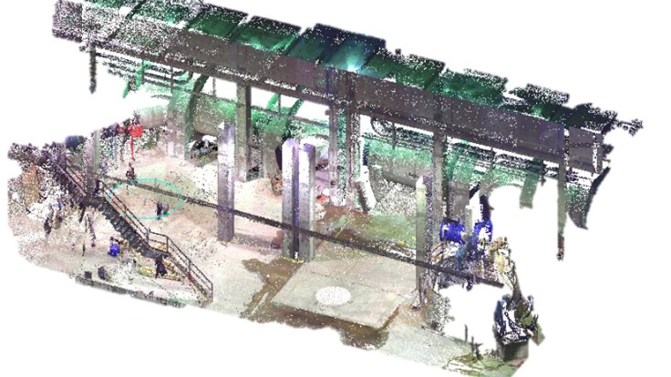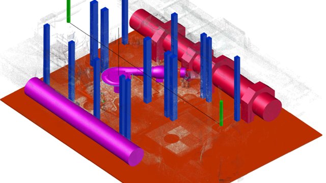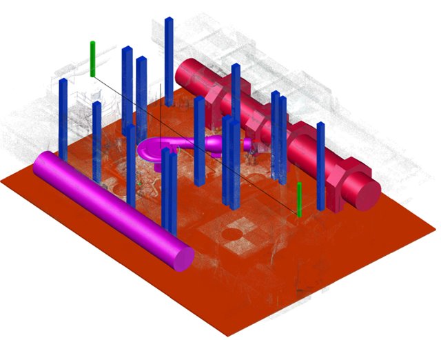 Relevé TQC de l’ensemble formé par la tuyauterie, la structure et la conduite d’amenée (espace clos) où le nouveau groupe pompe-moteur devra être installé. Le scan 3D permet aussi de réaliser l’implantation des équipements avec précision.