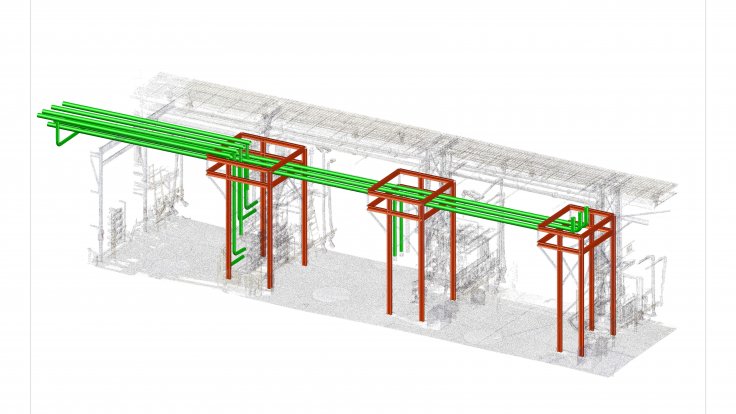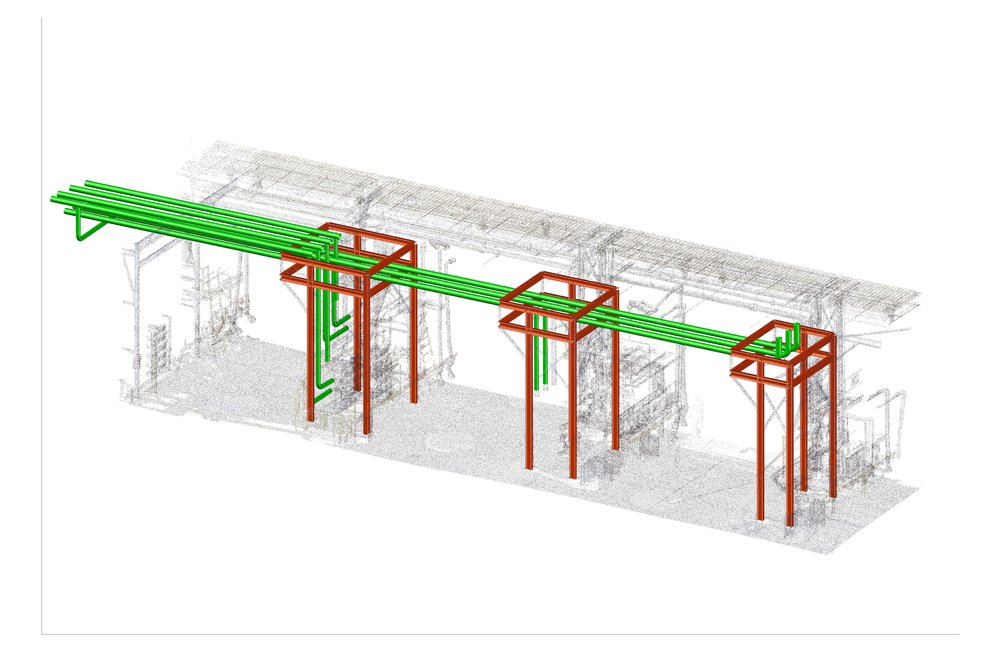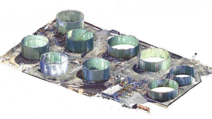 Dessins « tel que construit » (scan 3D et modélisation) de la tuyauterie et des éléments formant un parc pétrolier.